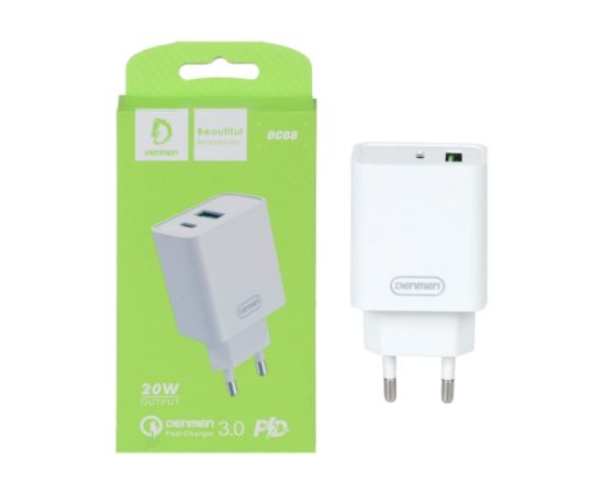 Адаптер питания сетевой Denmen DC08 PD 20W, 3.6А, 1 USB/1Type-C, 5V/9V/12V, пластик, белый, фирменная упаковка