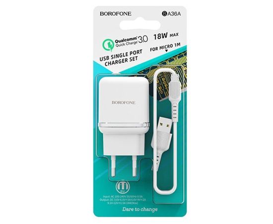 Адаптер Сетевой с кабелем Borofone BA36A High QC3.0 USB 3A/18W (USB/Micro USB) (white) (133679)