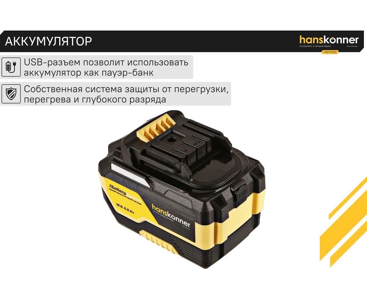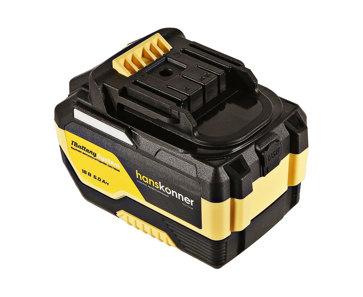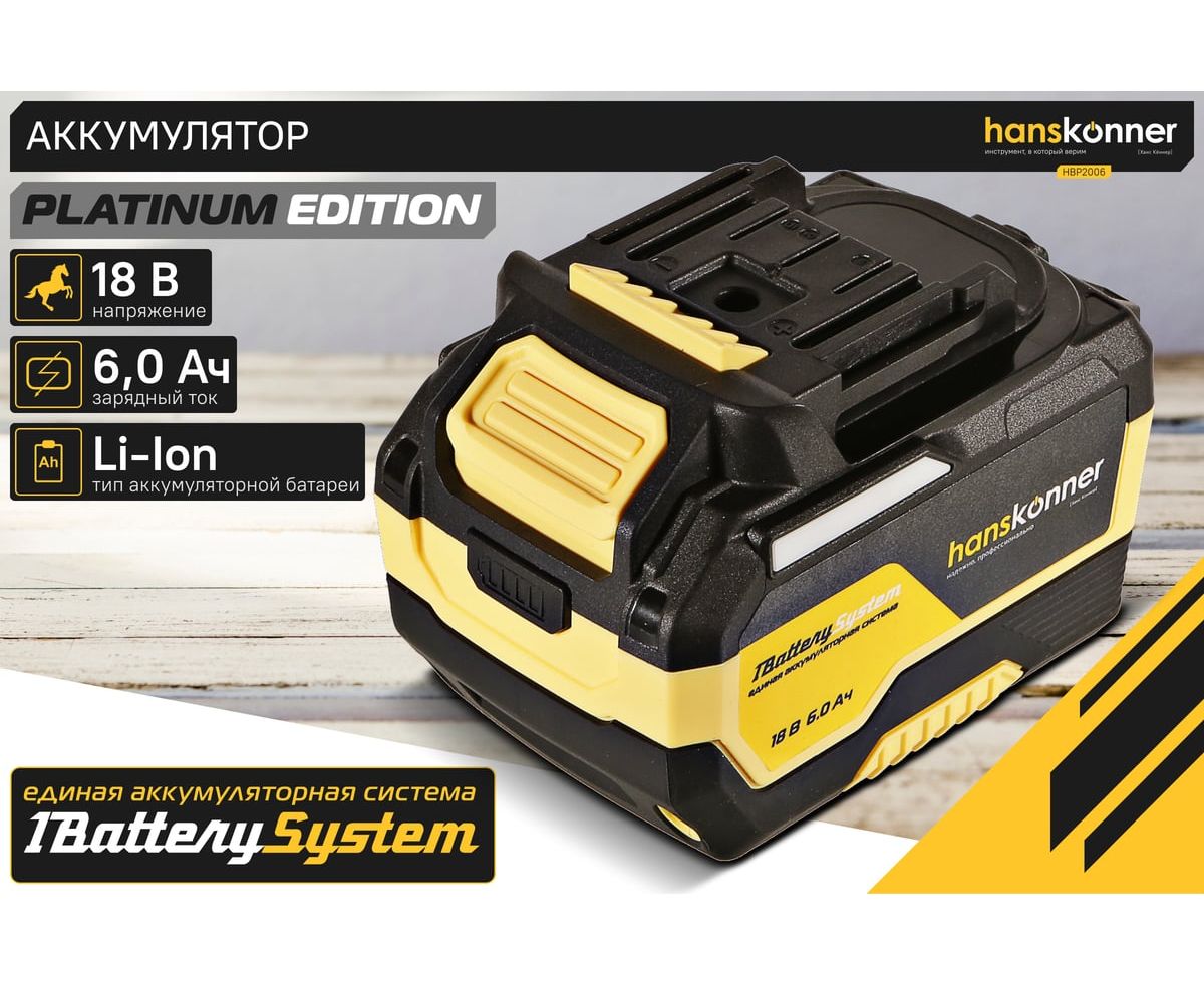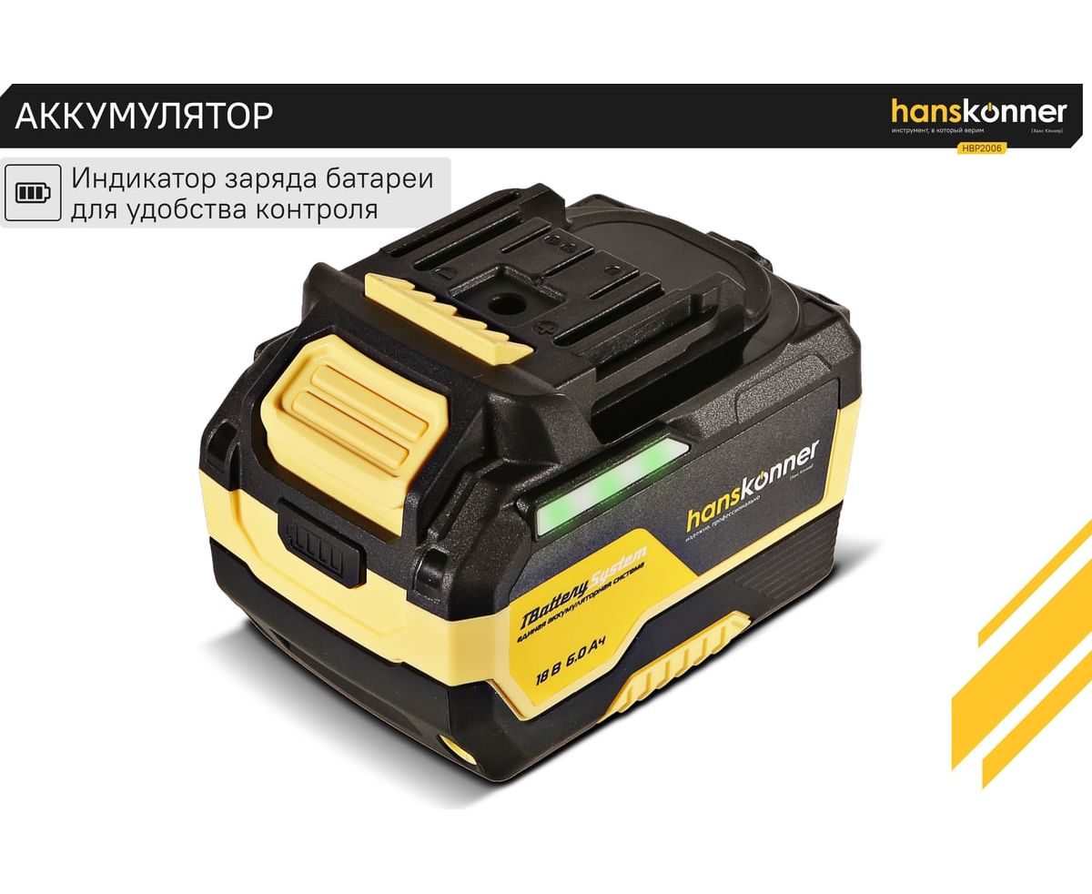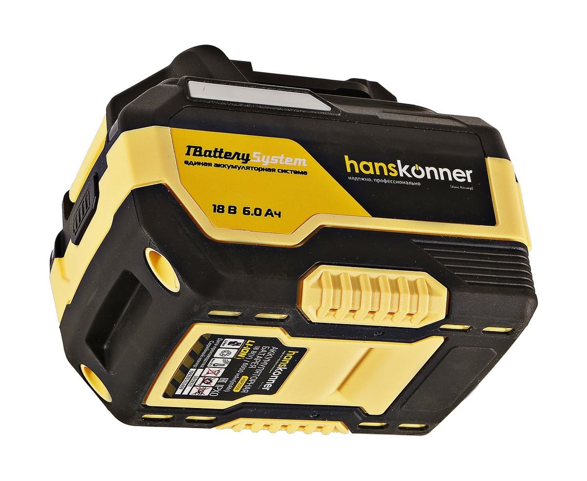 18-вольтовый аккумулятор HBP2006 Hanskonner емкостью 6.0 Ач обеспечивает впечатляющую мощность и совместим с любым инструментом единой аккумуляторной системы 1BatterySystem.