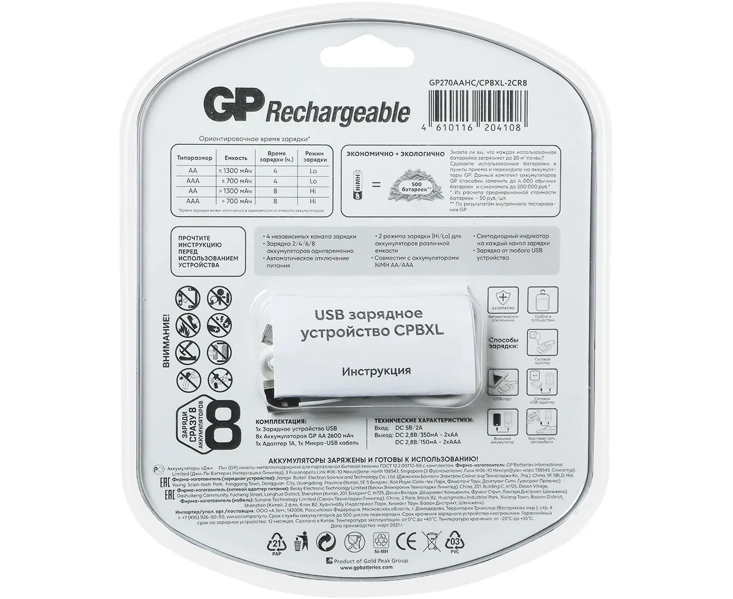 Аккумулятор + зарядное устройство GP PowerBank 270AAHC/CPBXL-2CR8 (1652192) AA 2700mAh, 3.7V 2.7 А·ч, 8 шт.