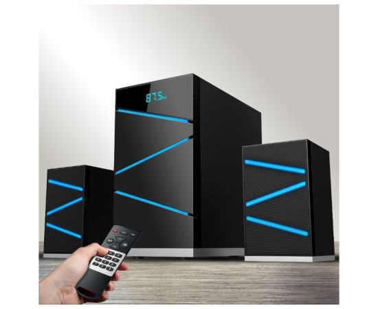FM радио: 87.5МГц - 108.0МГц. LED-подсветка сабвуфера и сателлитов, эквалайзер (классика, поп, джаз, рок, обычный, авто), режимы MUTE, STANDBY, сабвуфер - дерево(MDF)