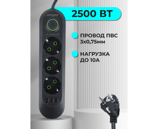 Сетевой удлинитель Amper , 2,0м, 3 розетки, 3*0,75мм, 10А, 2500 Вт, 3usb, черный