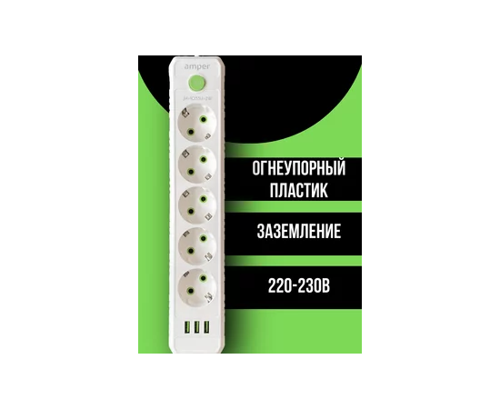 Сетевой удлинитель Amper , 4,0м, 5 розеток, 10А, 2500 Вт, 3usb, белый