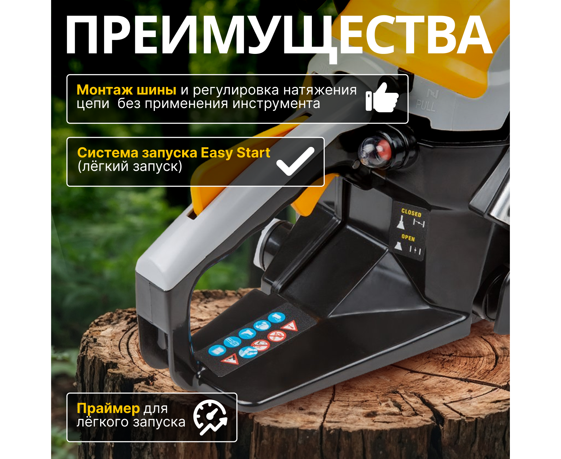 Зубчатый упор позволяет зафиксировать бензопилу при распиле, что предотвращает соскальзывание инструмента.