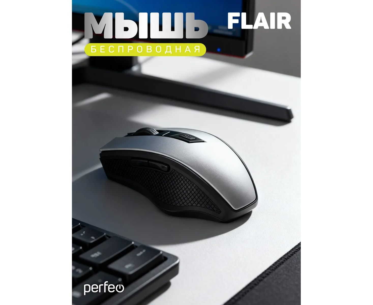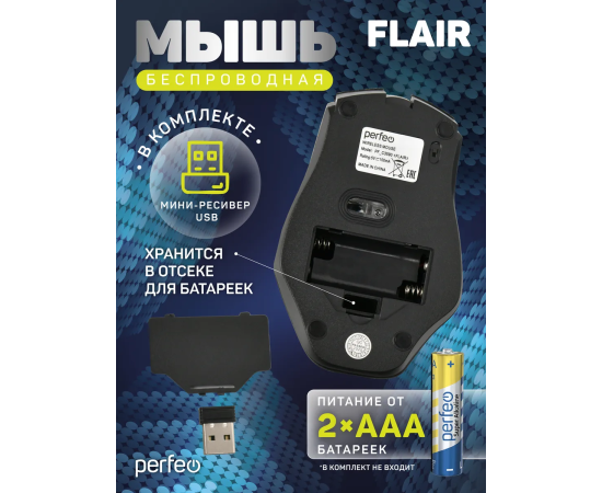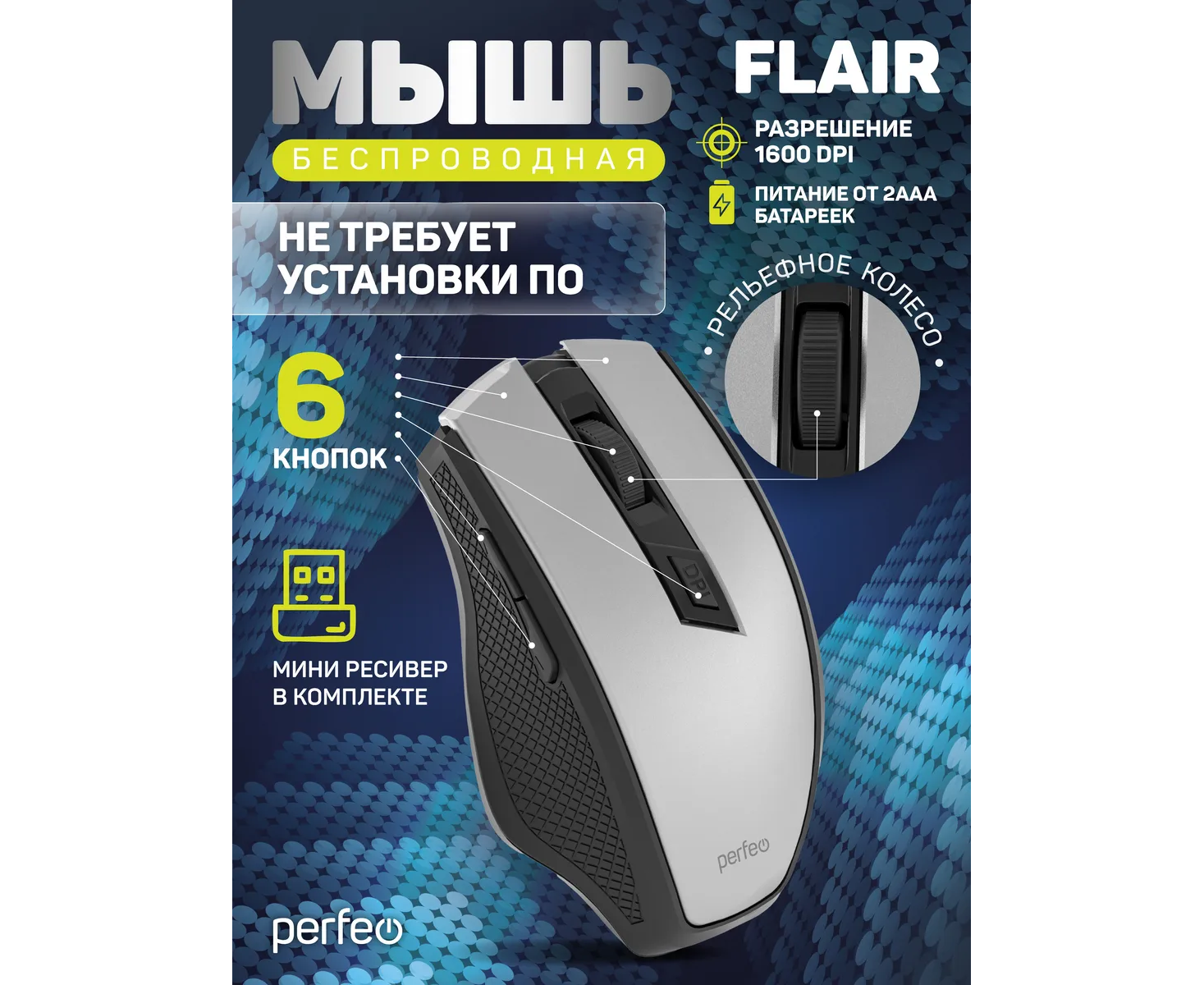 Модель Perfeo мышь беспров., оптич. "FLAIR", 6 кн, 800-1600 DPI, USB, серебро