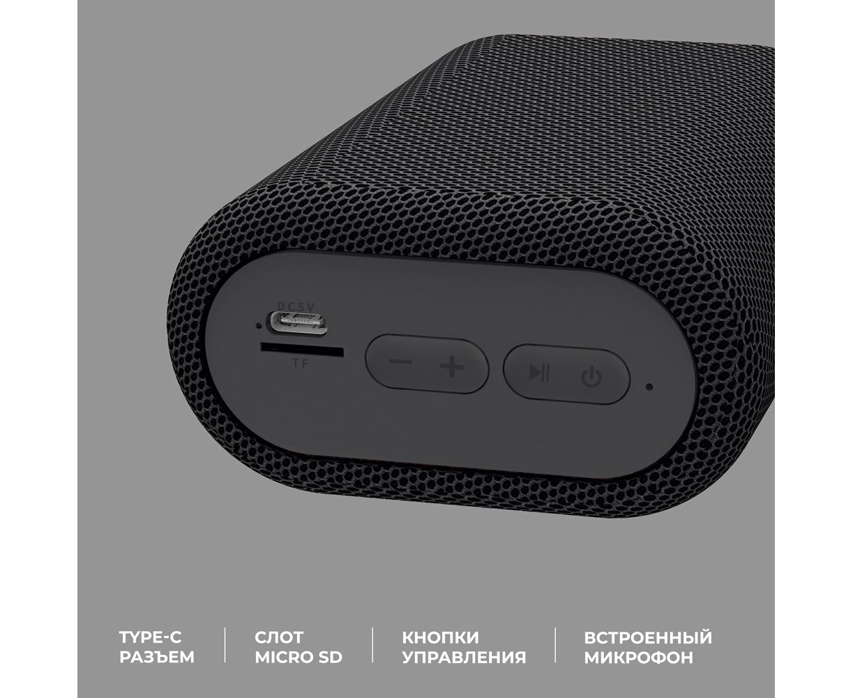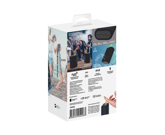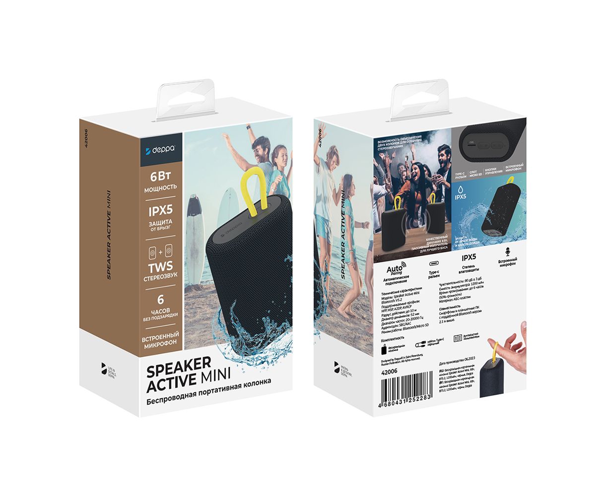 Беспроводная портативная колонка Speaker Active Mini от Deppa — это вещь, необходимая для веселого времяпрепровождения! Если вы организуете вечеринку у воды, ваша колонка точно не пострадает, даже если ненадолго упадет в воду, благодаря пылевлагозащите IPX5. Качественные динамики, высокая мощность и пассивный излучатель обязательно произведут впечатление на всех присутствующих, а для создания объемного стереозвучания вы можете воспользоваться функцией объединения двух колонок. С колонкой Speaker Active Mini можно закатить вечеринку до самого утра, ёмкость аккумулятора которого составляет 1200 мА*ч и обеспечивает до 6 часов непрерывной работы. Помимо Bluetooth-соединения, за передачу данных отвечают разнообразные разъемы: micro-SD, type-c. Speaker Active Mini от Deppa — ваш лучший помощник в организации праздника!