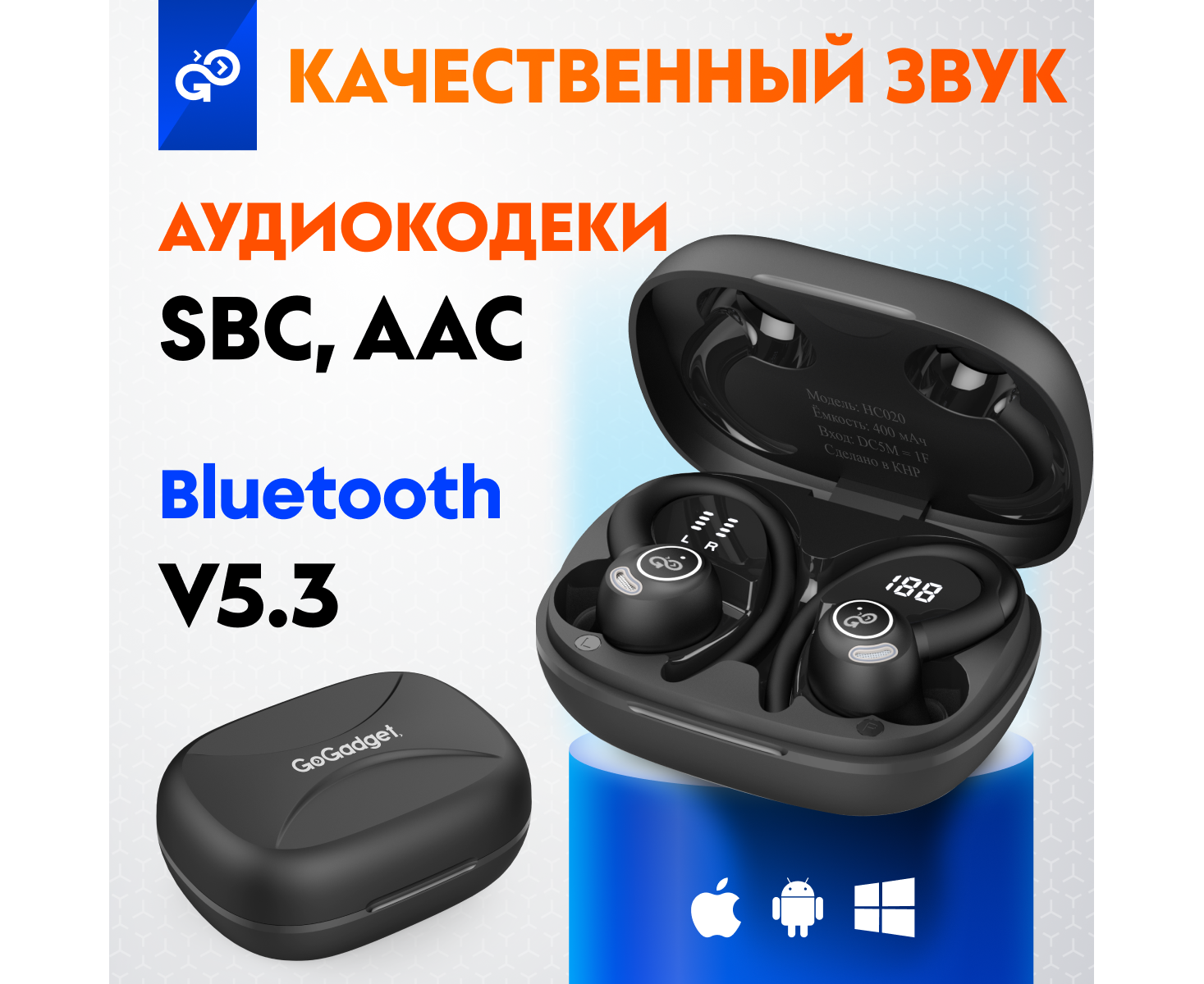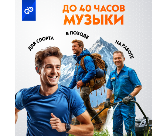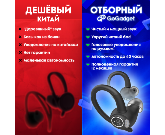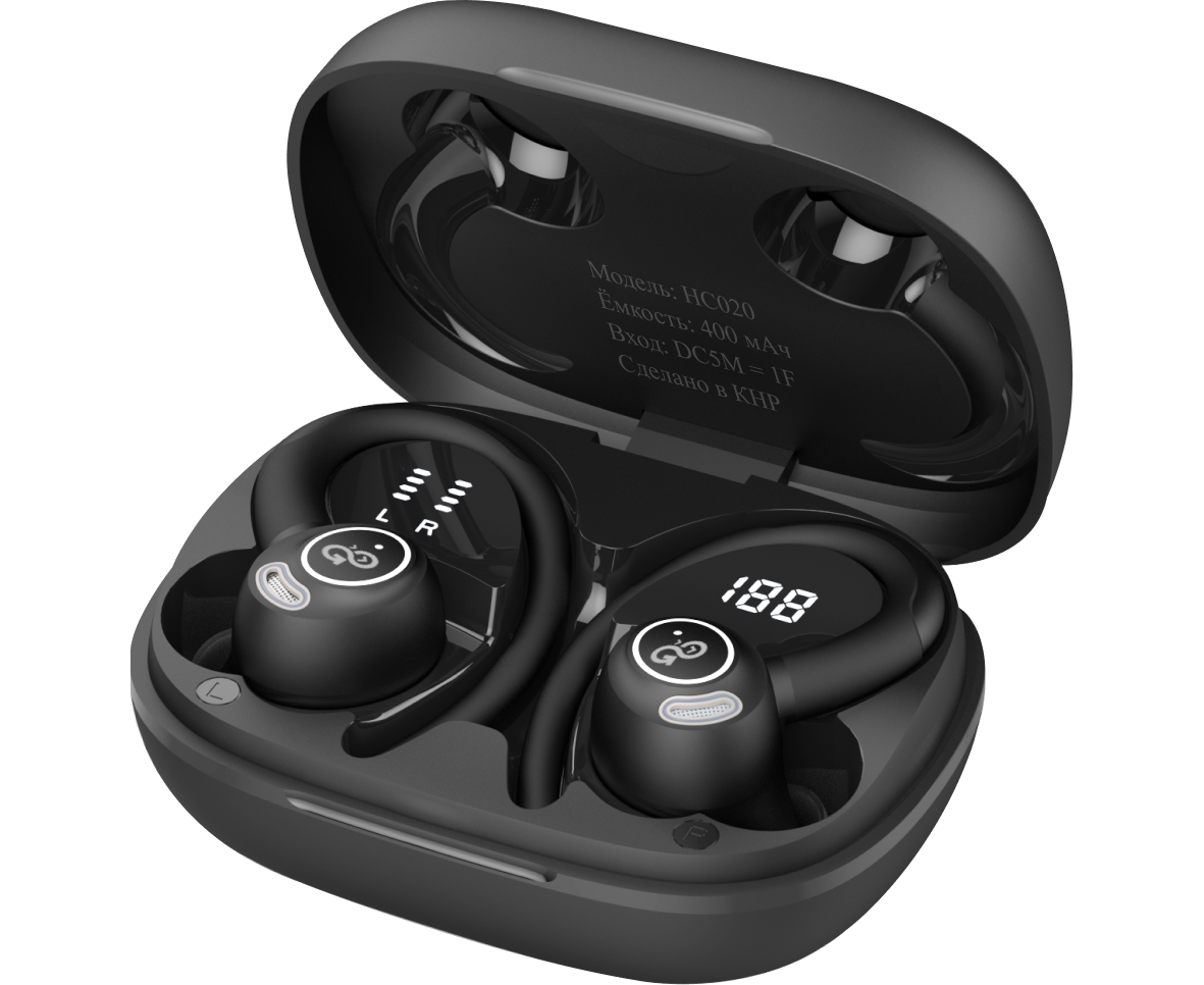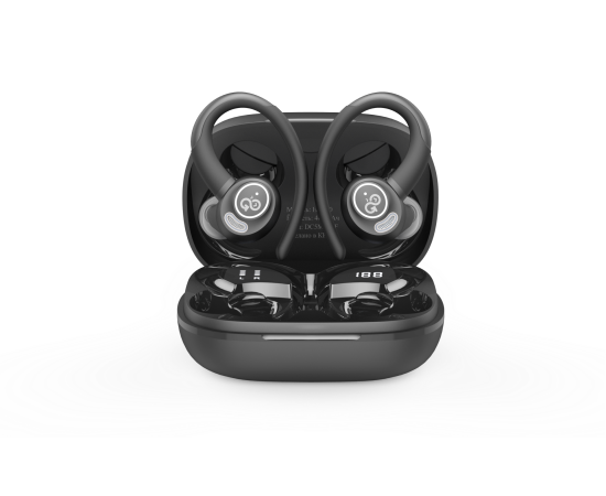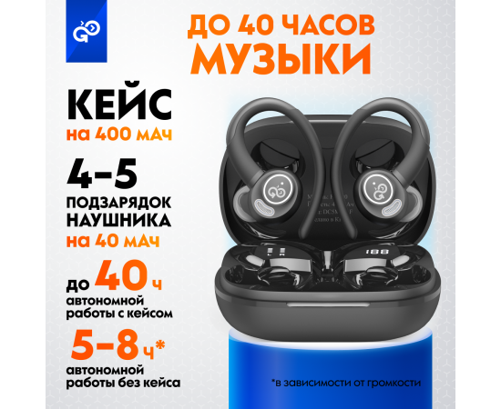 Беспроводные наушники GoGadget SportBuds Lite, вакуумные, заушины, EDR, 2 микр., 40+400 мАч, до 40 ч, IPX5, c дисплеем, ЧЕРНЫЙ