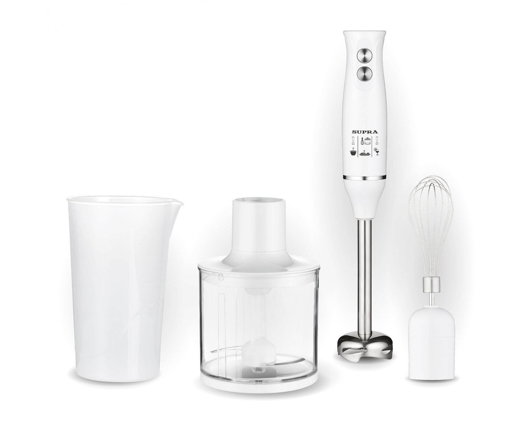 Комплектация блендер, съемная насадка-венчик из нержавеющей стали, мини-измельчитель 500 мл, чаша для взбивания 700 мл. с мерной шкалой