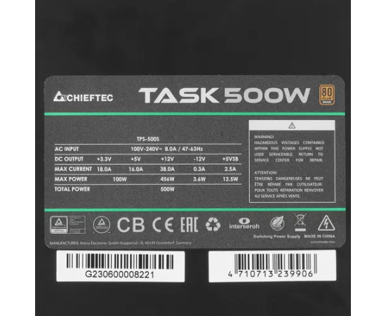 Блок питания Chieftec Task TPS-500S-Bulk (ATX 2.3, 500W, 80 Plus Bronze, Active PFC, 120mm fan) OEM