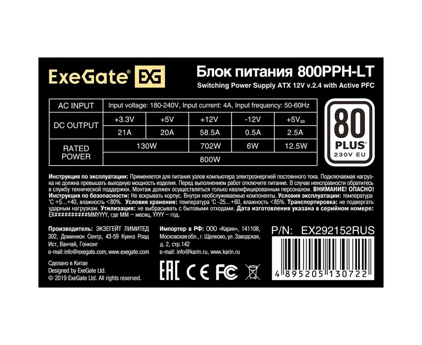 Блок питания ExeGate 800PPH-LT EX292152RUS 800W (ATX, APFC, КПД 82% (80 PLUS), 12cm fan, 24pin, 2x(4+4)