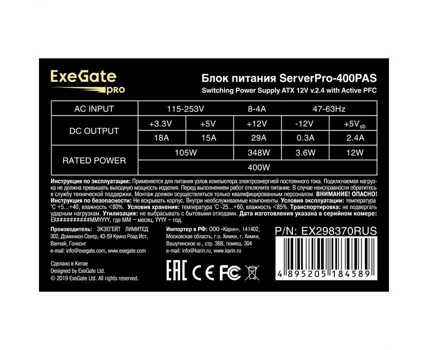 Блок питания ExeGate ServerPRO-400PAS EX298370RUS 400W (ATX, APFC, КПД 80 проц. (80 Plus), 12cm fan, 24pin, 2x(4+4)pin, 4xPCI-E, 6xSATA)