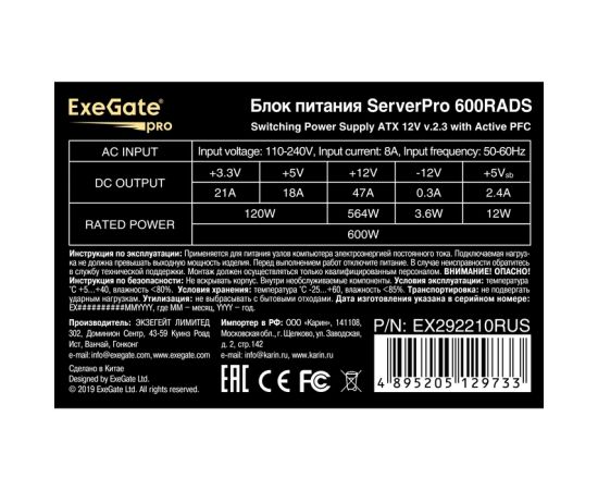 Блок питания ExeGate ServerPRO-600RADS EX292210RUS 600W (ATX, for 3U+ cases, APFC, КПД 80 (80 Plus), 14cm fan