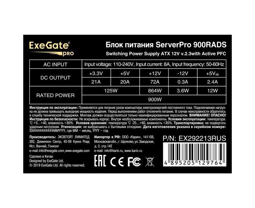 Блок питания ExeGate ServerPRO-900RADS EX292213RUS 900W (ATX, for 3U+ cases, APFC, КПД 80% (80 PLUS), 14cm fan