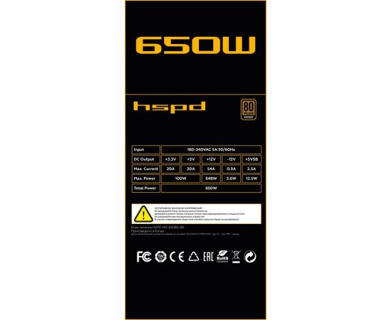 Блок питания/ Power Supply HSPD, 650W 80+ Bronze (ATX, 2.31, Semi-modular, 1x24(20+4)pin 550mm, 1xCPU*2 8(4+4)pin 600+150mm, 1xPCIe*2 8(6+2)pin 500+150mm, 2xSATA*3 400+150+150mm, 1xMOLEX4pin*3+FDD 400+150+150+150mm , Active, 120x120mm, 150x140x86mm, APFC, OVP, UVP, SCP, OPP, OCP, OTP, black)