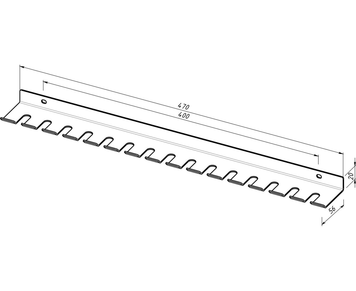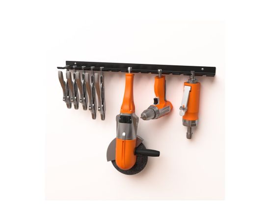 Держатель имеет продуманную конструкцию, предусматривающую 15 мест для хранения различных пневматических инструментов, а также возможность разместить: ручные зажимы для сварочных работ, фиксация и удержание которых осуществляется за зажимной болт М8/М10.