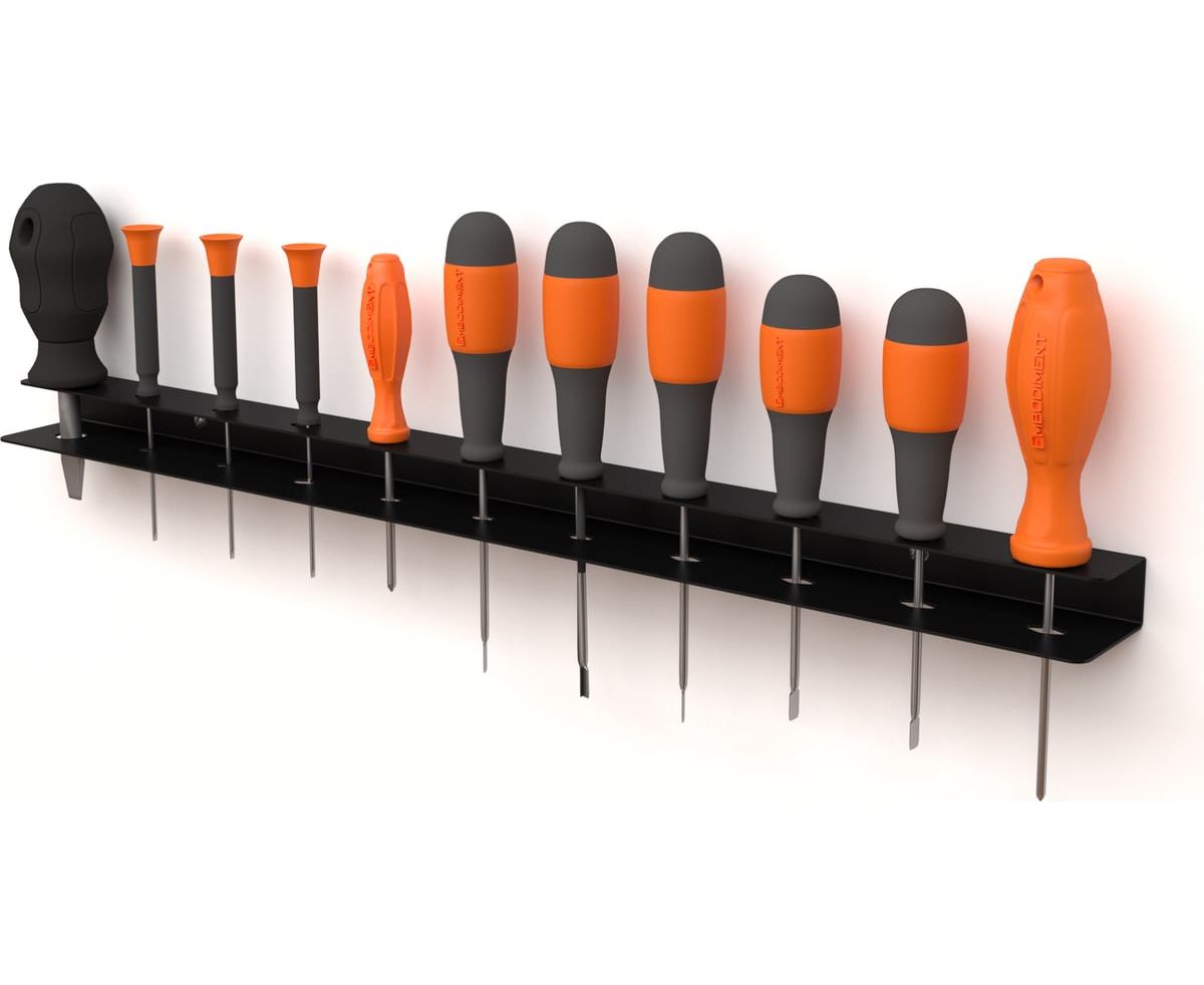 Настенный держатель-органайзер отверток EMBODIMENT черный EMB-WOSC-W-B поможет правильно организовать пространство и оптимизировать использование каждого сантиметра свободной площади. Кронштейн позволит легко и удобно расположить инструменты и станет идеальным местом их хранения в гараже, на балконе, складе и мастерской, кладовке и в других местах. Обеспечивает порядок на рабочем месте и быстрый доступ к инструменту, который легко можно достать для работы и по окончанию - вернуть на свое постоянное место. Держатель имеет продуманную конструкцию, предусматривающую место для хранения 11 отверток следующих видов: SL (прямой), PH (крестообразный), PZ (крестообразный с засечками), HX (шестигранник) и TORX, а также шило и надфили.