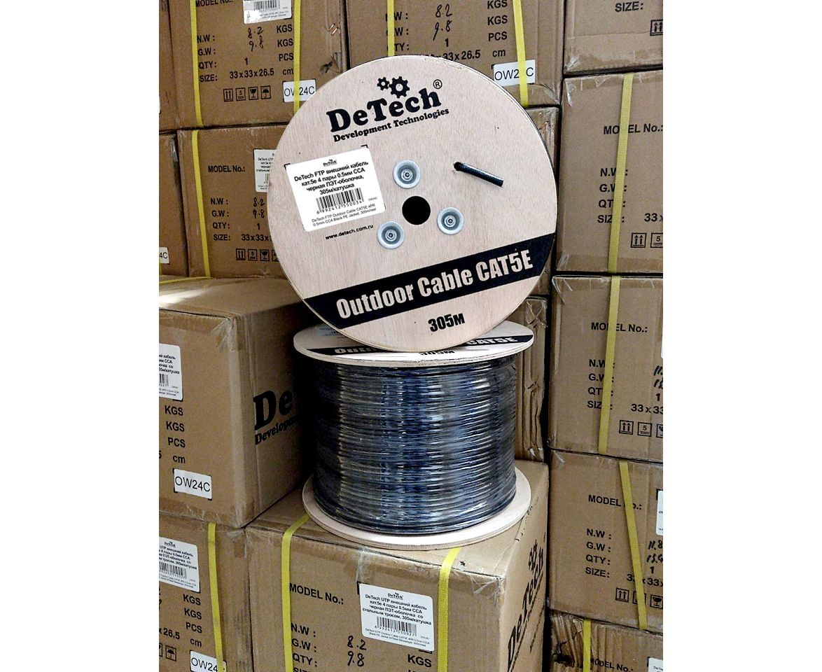 DeTech FTP внешний кабель кат.5е 4 пары 0.5мм CCA черная ПЭТ-оболочка, 305м/катушка