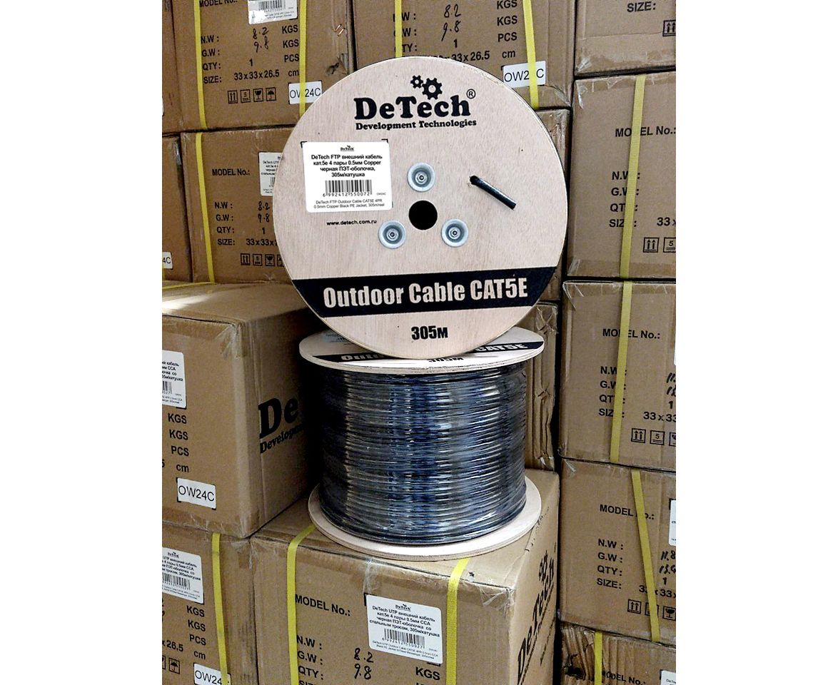 DeTech FTP внешний кабель кат.5е 4 пары 0.5мм Copper черная ПЭТ-оболочка, 305м/катушка