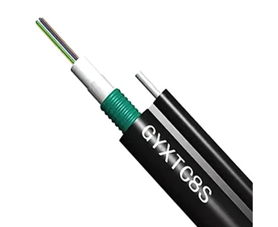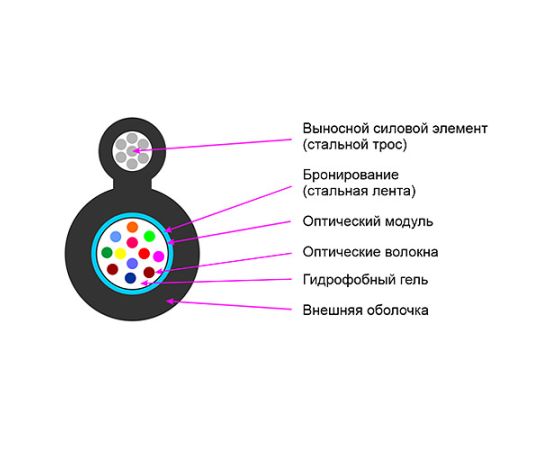 Подвесной оптический кабель, предназначен для наружной прокладки между опорами. Применяется в FTTx сетях, а также для прокладки в сетях до рабочих мест или до квартир и офисов абонентов. Кабель содержит 4 оптических волокна, соответствующие стандарту G.652D. Для защиты трубки с волокнами выполнено бронирование стальной лентой. В качестве силового элемента для подвеса используется стальной трос из 7 жил диам. 0,4мм. Внешняя оболочка изготавливается из MDPE (полиэтилен средней плотности). Кабель смотан в бухты по 1000 м на деревянной катушке.