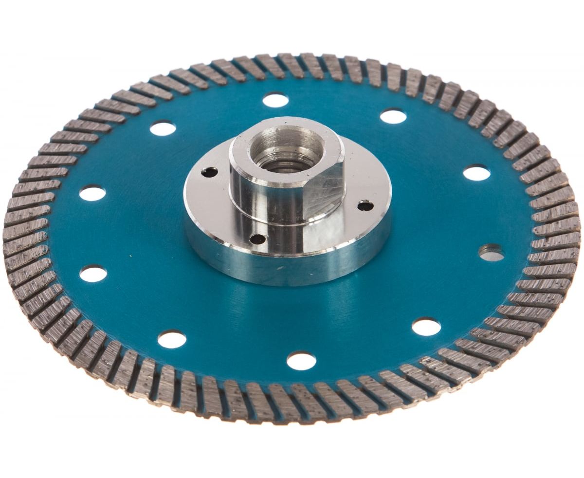 Особенности: фланец М-14 не только позволяет устанавливать данный диск на УШМ без зажимной гайки, но и значительно усиливает корпус диска, что дает возможность работать с материалом под любым углом, создавая дополнительные возможности в работе.