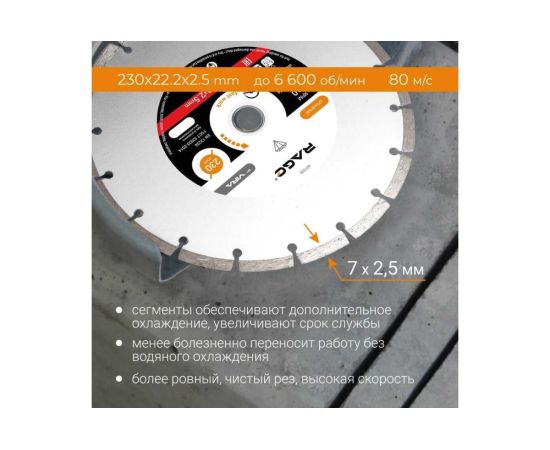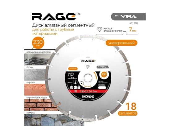 Диск алмазный сегментный HQ 230 мм VIRA RAGE 601230 предназначен для угловых шлифовальных машин. Применяется для сухого реза бетона, мрамора, гранита, кирпича, тротуарной плитки и бордюрного камня. Высота алмазного слоя - 2.5 мм.