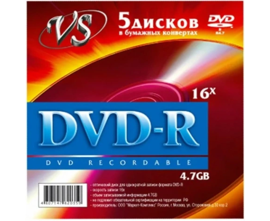 Диск DVD+R VS VSDVDPRK501, 4,7Гб, 16х, бумажный конверт 5шт