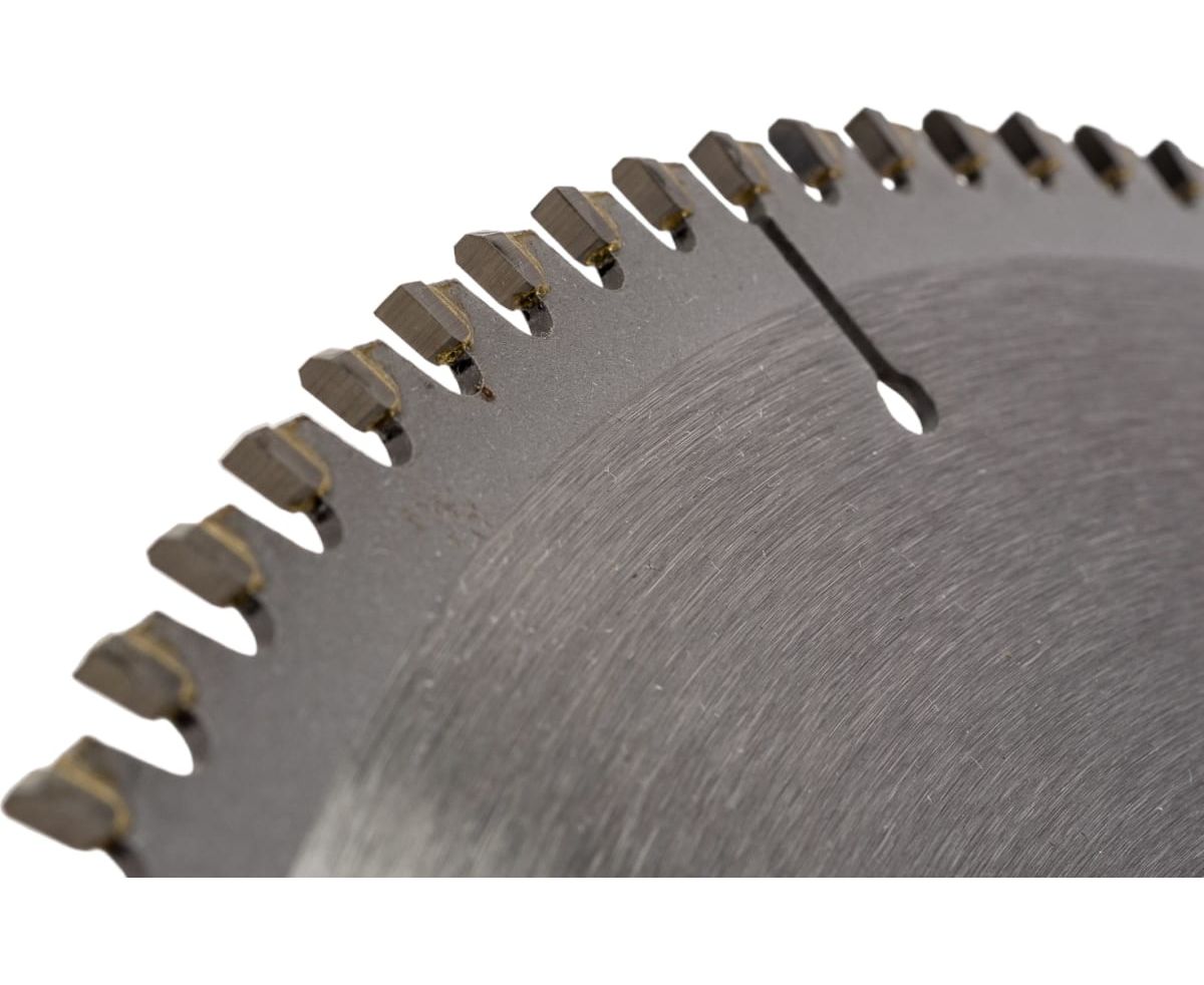 Твердосплавные зубья диска выполнены в форме трапеции, а передний угол имеет отрицательную величину (-5о), за счет чего достигается качественный пропил тонких материалов.