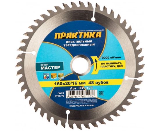 Диск пильный твёрдосплавный по ламинату Практика 160 х 20/16 мм (031-174) 48 зубов