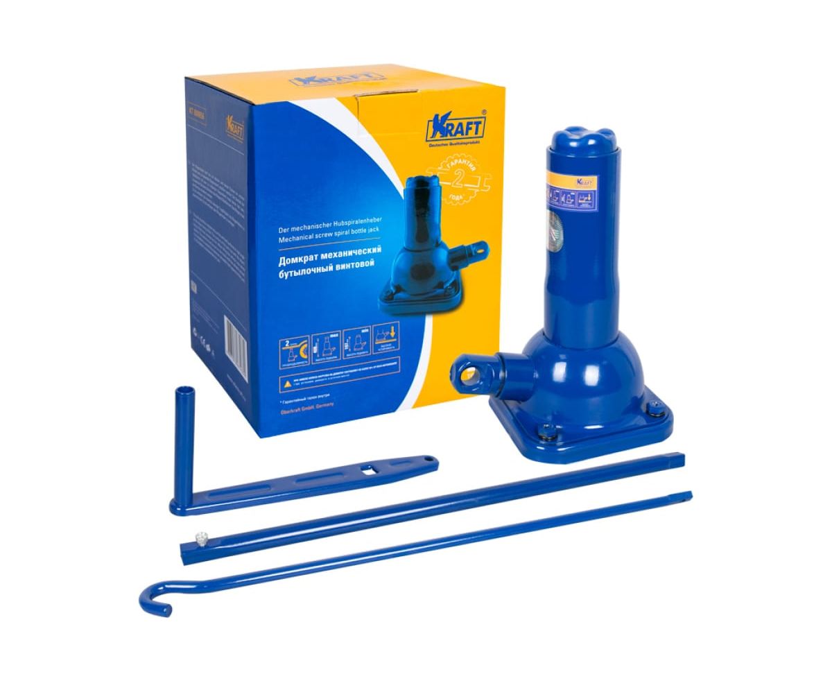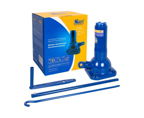 Механический бутылочный домкрат KRAFT 2Т 215-485 мм KT 800057 - небольшие габариты позволяют использовать его как при ремонте автомобиля, так и для различных строительных операций. Благодаря надежности и практичности конструкции домкрат можно использовать в любых условиях. Принцип работы: вращательное движение постепенно переходит в поступательное. На червячный винт, находящийся на редукторе внутри корпуса, передается от шестерни и крутящего винта крутящий момент. Именно за счет этого и происходит поднятие груза на определенную высоту.
