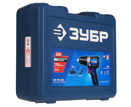 ЗУБР Профессионал 20 В, 70 Н·м, 2 АКБ LMS (4 А·ч), бесщеточная дрель-шуруповерт, кейс DB-70-42 - ЗУБР Профессионал 20 В, 70 Н·м, 2 АКБ LMS (2 А·ч), бесщеточная дрель-шуруповерт, кейс DB-70-22 - высокотехнологичная модель в новой линейке аккумуляторного инструмента ЗУБР серии LMS.