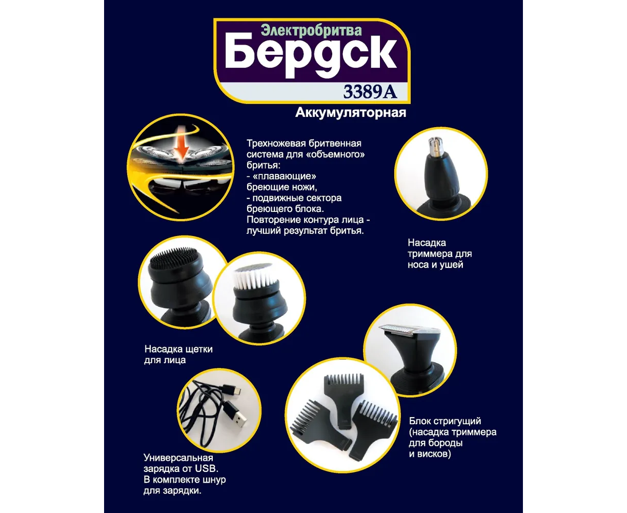 Электробритва "БЕРДСК" модель 3389А - электроприбор личной гигиены, предназначенный для сухого бритья. Прибор предназначен для использования в домашних условиях. Прибор состоит из корпуса и насадки. В зависимости от установленной насадки может быть использован в качестве электробритвы, триммера для висков, триммера для носа, щетки для лица.