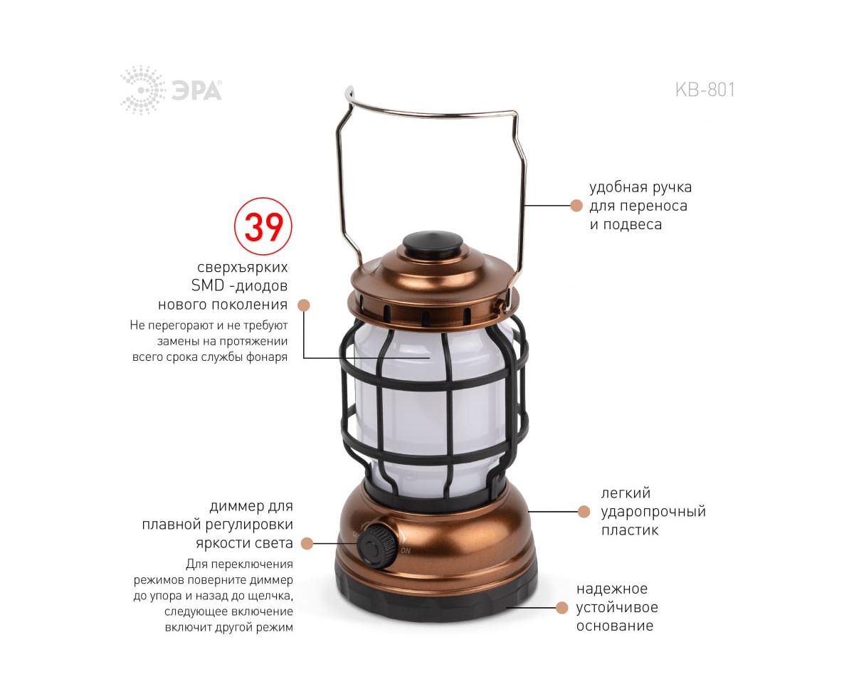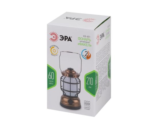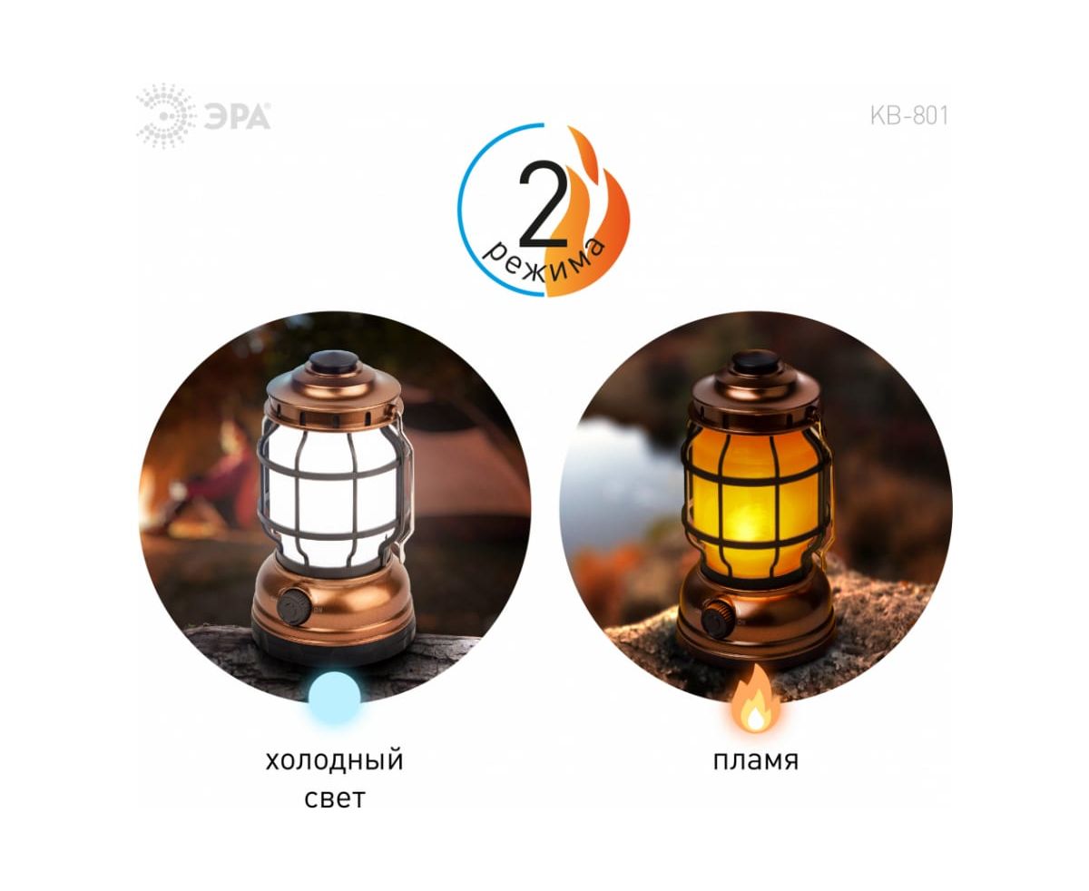 Светодиодный кемпинговый фонарь ЭРА KB-801 Факел на батарейках 2 режима холодный+пламя Б0054042 - кемпинговый фонарь в ретро-стиле. Светит в 2 режимах – холодный белый свет и режим теплого пламени. Работает от 3 пальчиковых батареек (3 х АА). Одного комплекта алкалиновых элементов питания хватает на 60 часов непрерывного свечения.