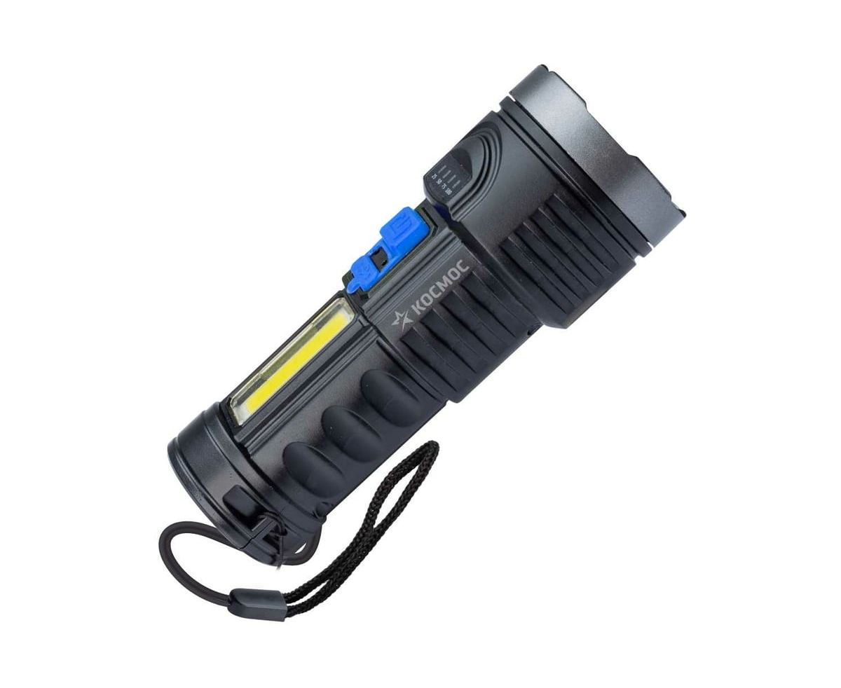 Ручной аккумуляторный фонарь КОСМОС 3Вт LED+3Вт COB, Li-ion 18650 1200mAh, ABS-пластик, индикатор, USB-шнур KOS115Lit с мощностью и свойствами прожектора в легком ручном корпусе. Совмещает луч фонаря (направленный свет) и широкий свет (освещает широкое пространство с одной стороны). Источник питания: Li-ion аккумулятор 18650 3,7В 1200 мА/ч (встроенный). Источник света: мощный луч 3Вт LED; мощный боковой светильник 3Вт COB LED.