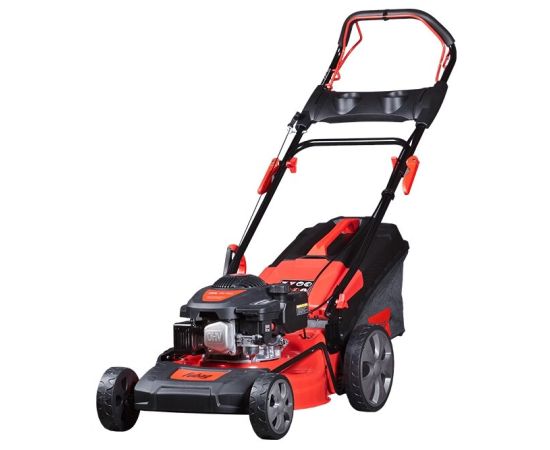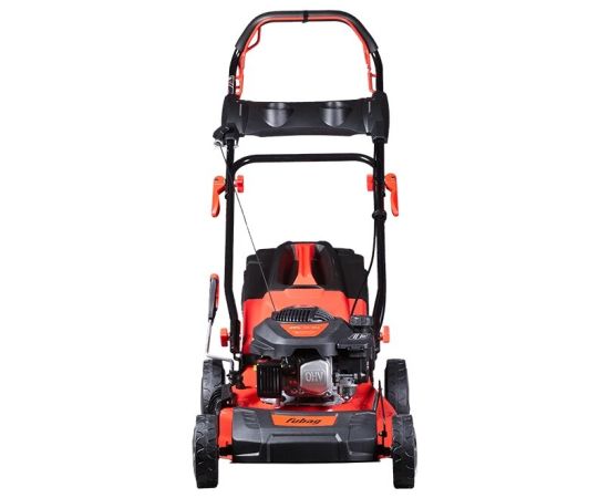 Надежный четырехтактный двигатель. Сбор в травосборник/задний выброс. Широкие колеса на подшипниках, не портящие газон. Центральная регулировка высоты скашивания. Индикатор наполнения травосборника. Удобная складная ручка с антивибрационной накладкой. Праймер для легкого запуска.