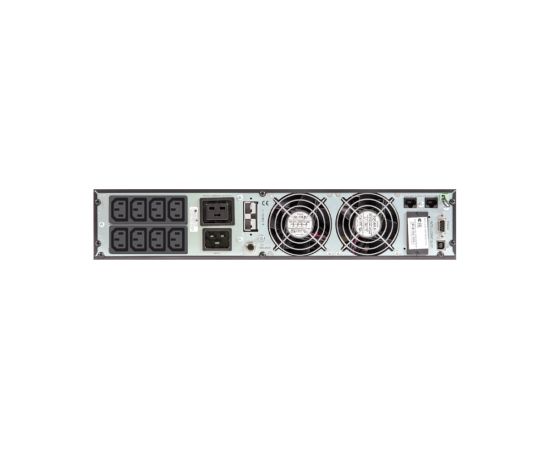 220 В, 3000 ВА (2700 Вт), Online, синусоидальная форма выходного напряжения, световая и звуковая индикация режимов работы, ЖК-дисплей, необходимое кол-во АКБ для работы – 6 шт. (72 В) ёмкостью 40...120 Ач. Ток заряда АКБ – 6 А. Количество выходных разъемов — IEC C13 - 8 шт., IEC C19 — 1 шт. Дистанционный мониторинг по RS 232, USB, порт для платы релейного интерфейса. Функция удалённого аварийного отключения выходного напряжения (EPO). Корпус под 19" шкаф, высота 2U или настольная установка.