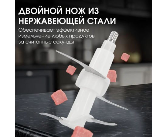 Моторный блок, чаша измельчителя, двойной универсальный нож из нержавеющей стали, инструкция по эксплуатации, гарантийный талон