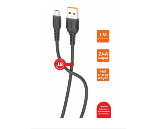 оплетением из ПВХ и усиленными коннекторами. Пропускнаяспособность кабеля 2.4А обеспечивает поддержку быстрой зарядки (FAST CHARGE).