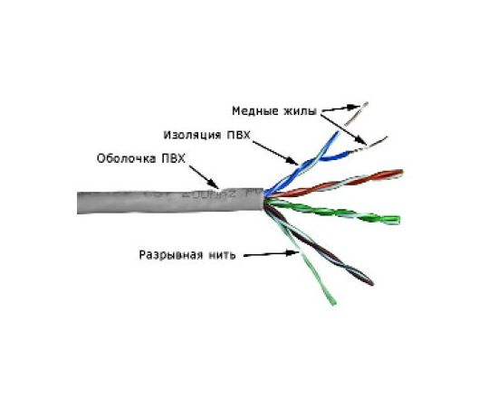 Описание4 витых пары заключены в общую оболочку из ПВХ (PVC) серого цвета Проводник - сплошная медная жила диаметром 24AWG Для удобства разделки кабеля под оболочку укладывается разрывная нить, при вытягивании которой образуется продольный разрез. На оболочке кабеля нанесены последовательные метровые метки длины.