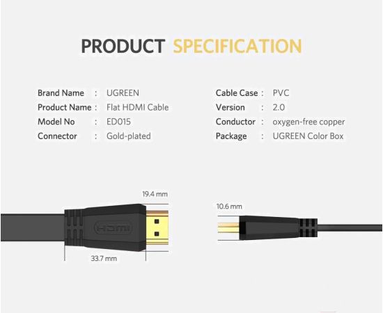 Кабель UGREEN ED015 50820 HDMI Flat Cable 3m