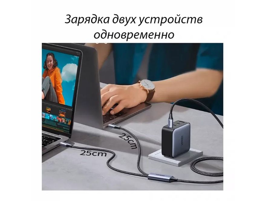 Максимальная мощность 100 Вт: быстрая зарядка ноутбуков или смартфонов с разъемом USB-C при максимальном напряжении 20 В и силе тока 5 А, поддержка быстрой зарядки Power Delivery PD мощностью 100 Вт, 60 Вт, 45 Вт, 30 Вт, 18 Вт.