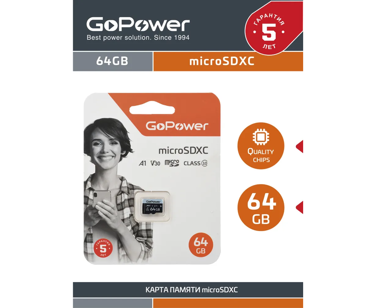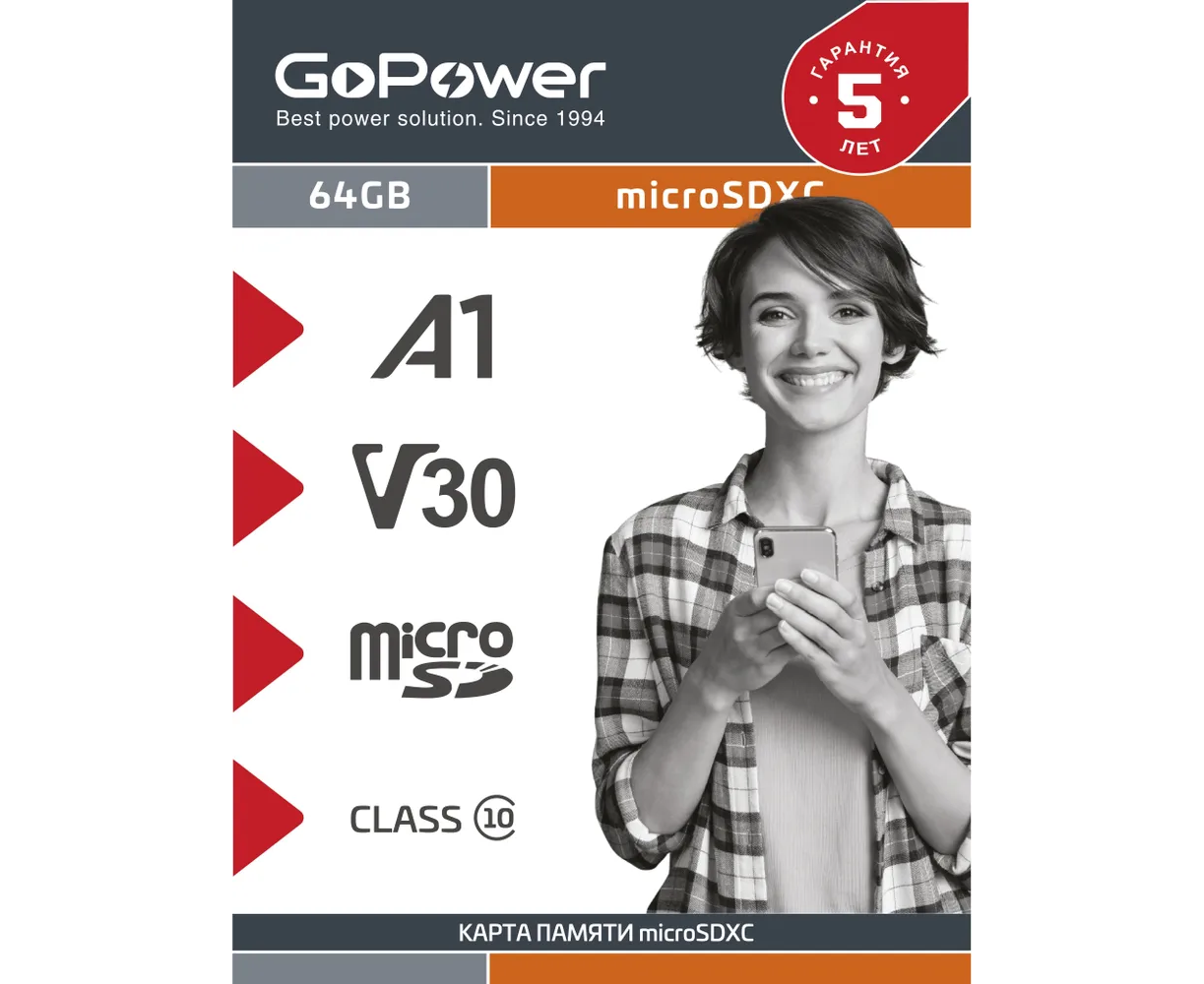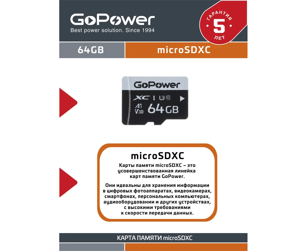 Карта памяти GoPower 00-00025677 microSD 64GB Class10 70 МБ/сек V30 без адаптера