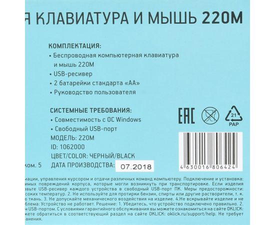 Комплект поставки: Беспроводная компьютерная клавиатура и мышь 220М.