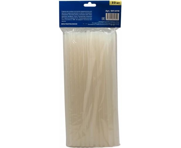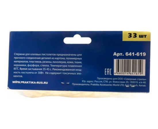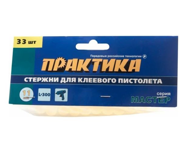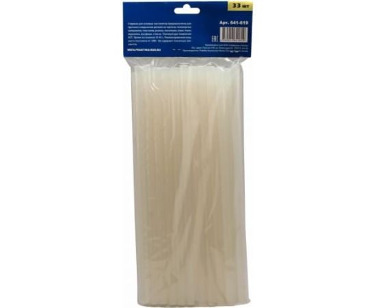 Клей белый, прозрачный (33 шт; 11х300 мм) для клеевого пистолета ПРАКТИКА 641-619 предназначен для прочного соединения деталей из картона, полимерных материалов, пластиков, резины, линолеума, кожи, ткани, керамики, фарфора, стекла. Температура плавления 85°С. Время застывания 35-45 с. Рекомендованная мощность пистолета от 30 Вт. Не содержит токсичных элементов.