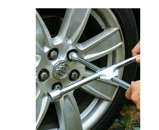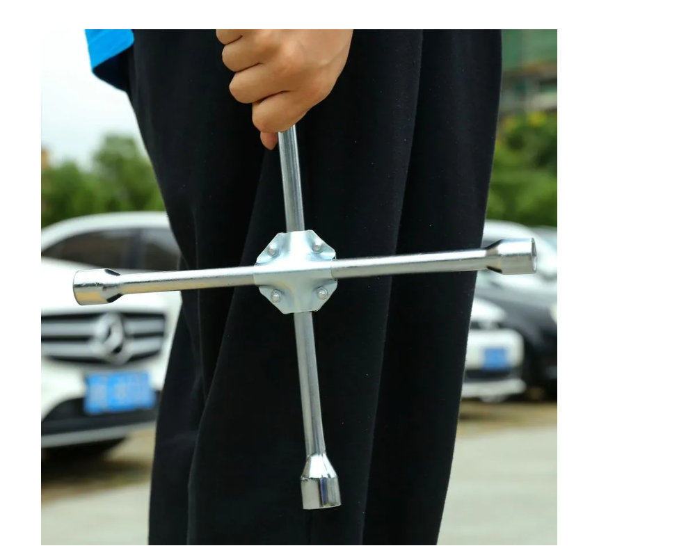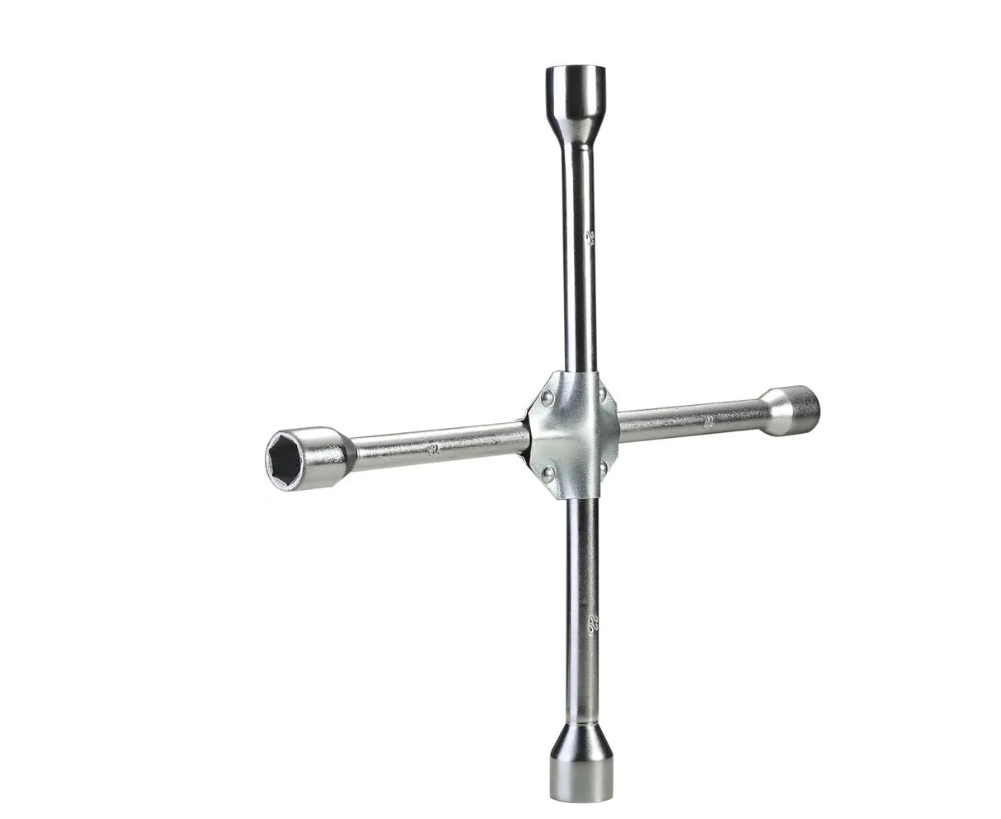 Ключ баллонный крестовой предназначен для снятия и установки колес автомобиля. Конструкция специнструмента позволяет увеличить рычаг приложения усилий в тех ситуациях, когда это необходимо для оперативной работы при замене колеса. Имеет четыре головки размерами 17 мм, 19 мм, 21 мм и 22 мм.
