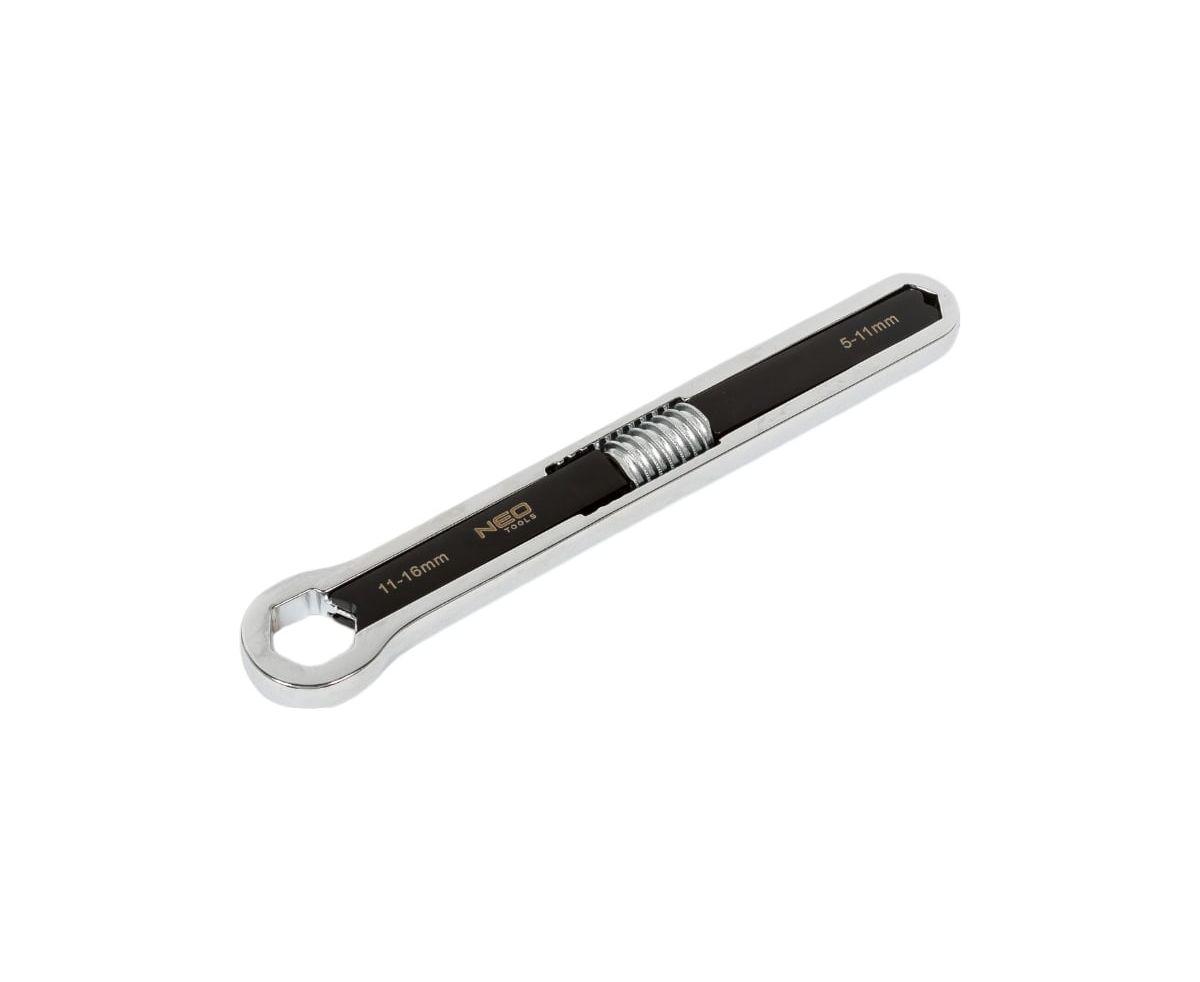 NEO Tools Разводной ключ 5 - 16 мм двойное кольцо 03-030 изготовлен из высокосортной хромованадиевой стали, отличатся долголетней прочностью. Наличие пружины позволяет подобрать ключ к разным размерам крепежа. Гарантией высокого качества и надежности инструмента является сертификат TÜV Rheinland.0