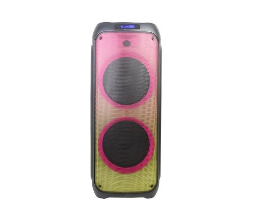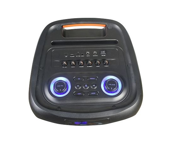 Управлениена верхней панели: переключатель питания (сеть/аккумулятор/выкл), следующая запись/радиостанция, предыдущая запись/радиостанция, воспроизведение/стоп, выбор режима (источника звука), общая громкость больше/меньше, громкость микрофона больше/меньше, эквалайзер, цветомузыка, эхо микрофона больше/меньше, повтор воспроизведения, мега бас