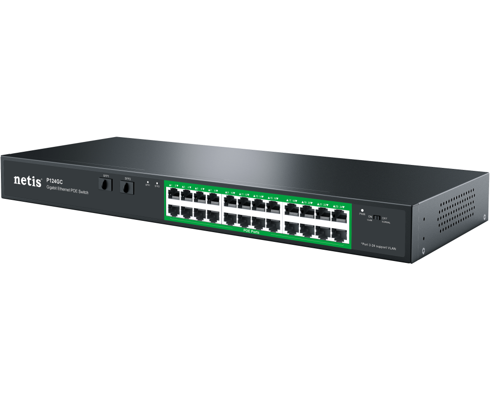 Коммутатор неуправляемый Netis P124GC PoE+, 26 портов, 24x1Гбит/с, PoE+ 24х30Вт (до 360Вт), Uplink SFP 2x1Гбит/с