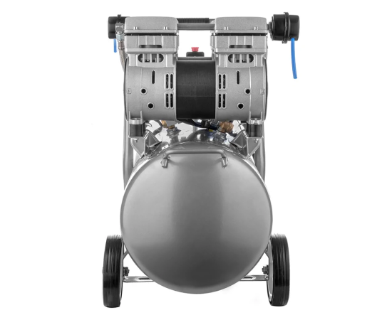 Оборудование подключается к бытовой электросети с напряжением 220 В. Чтобы облегчить запуск двигателя, стравливающий клапан остается открытым несколько секунд после включения. К паре штуцеров можно подключить одновременно два пневматических инструмента с помощью быстросъемных соединений. Манометры показывают уровень давления в накопительном баке и на выходе.