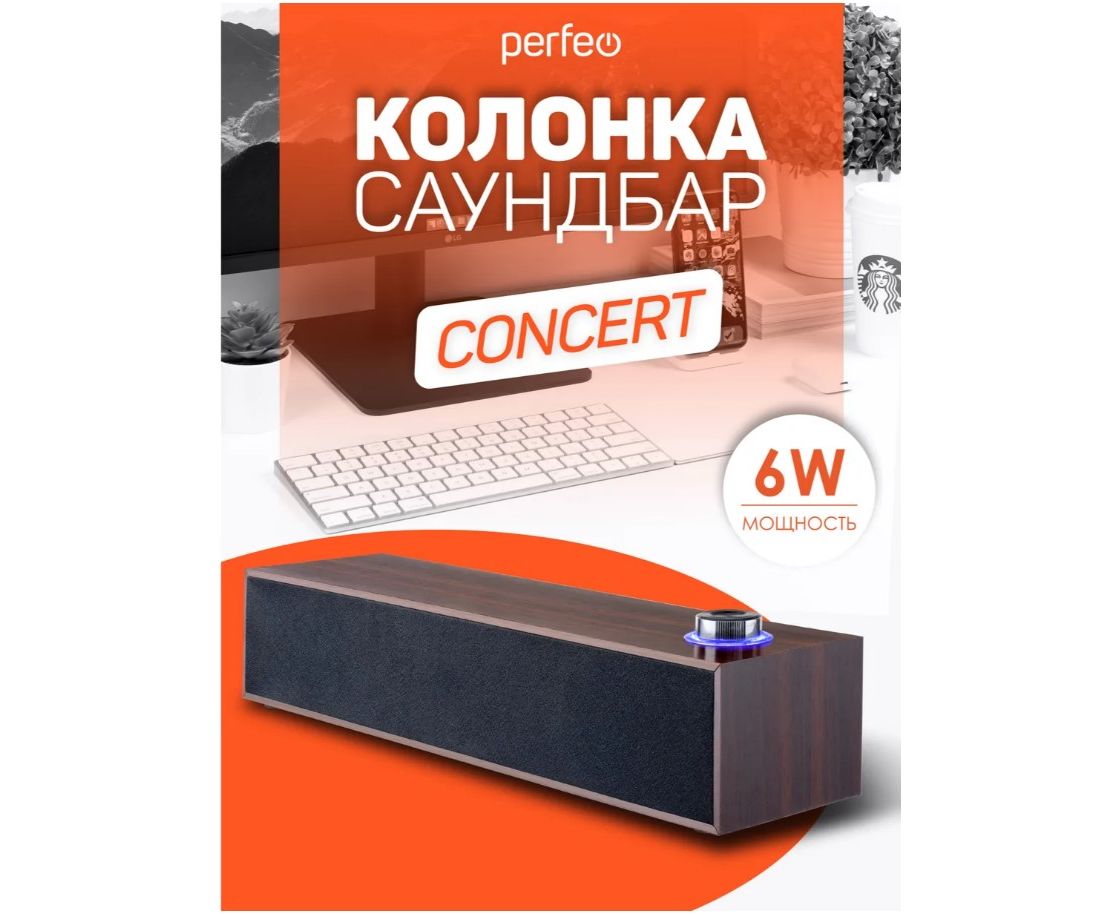 Колонка-саундбар "CONCERT" - идеально подойдёт для тех, кто работает за компьютером или ноутбуком, увлекается компьютерными играми, любит отвлечься на любимую музыку, аудиокниги, подкасты или хорошие фильмы. Подключение саундбара " CONCERT " к источникам звука осуществляется с помощью аудиокабеля с штекером Jack 3,5 мм. Питание саундбар получает через USB кабель, посредством подключения к электросети через сетевой адаптер (в комплект не входит), либо саундбар можно подключить к Power Bank'у. Саундбар "CONCERT" подарит вам яркий и насыщенный звук благодаря выходной мощности 6 Вт, а с помощью регулятора с подсветкой на верхней панели корпуса колонки очень удобно регулировать громкость звука! Корпус сделан из высококачественного МДФ с имитацией структуры дерева. Колонка "CONCERT" имеет стандартный 3.5-мм штекер с помощью которого возможно подключение практически к любому совместимому аудиоустройству. Длина USB и аудио кабеля (1,3 м) позволяет размещать саундбар там, где вам комфортно и необходимо.