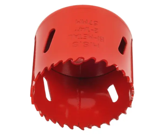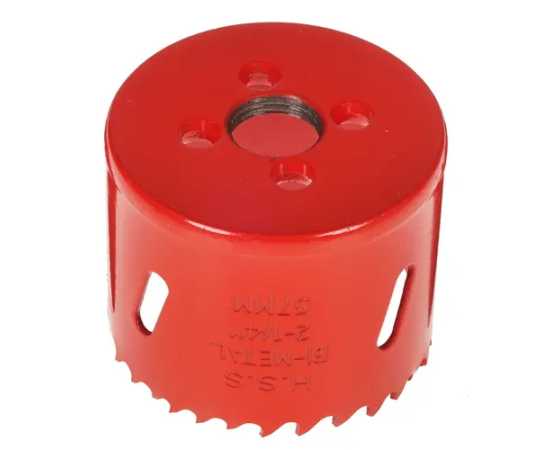 Коронка диаметром 57 мм разработана для сверления отверстий в цветных и черных металлах, дереве, пластиках. Конструкция изделия предусматривает наличие отверстий по всей окружности, которые позволяют охлаждать оснастку в процессе сверления, не допуская ее перегрева. Для этой же цели процесс сверления необходимо сопровождать водяным охлаждением. Длина коронки равна 39.2 мм.